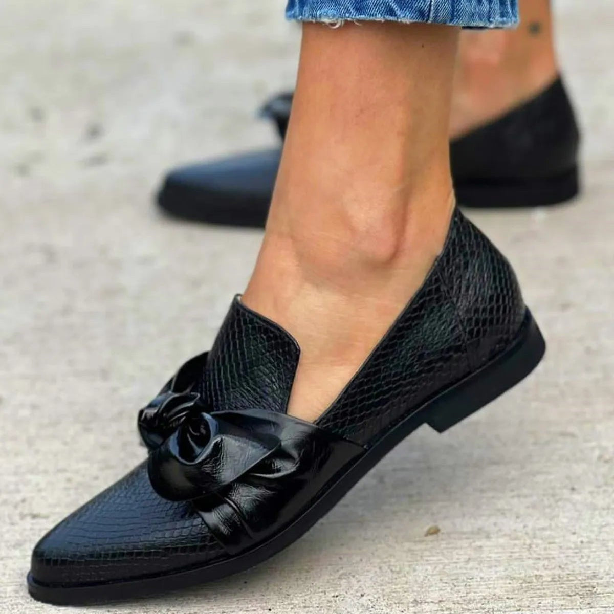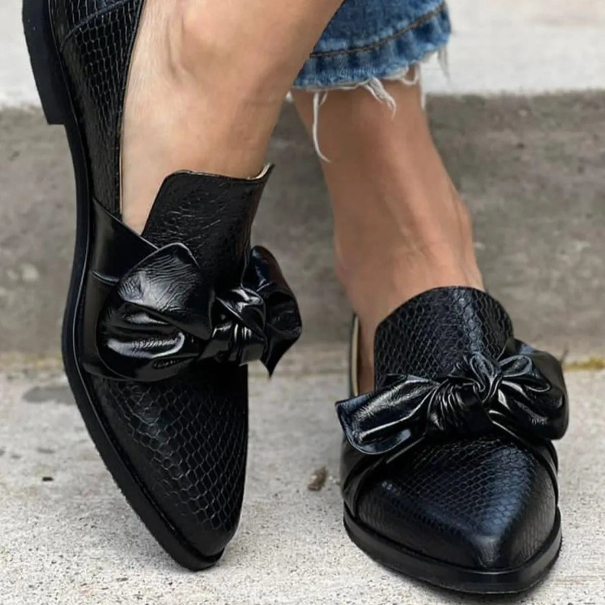Dessa slip-on loafers för kvinnor har en spetsig tå och strukturerad ovandel, kompletterat med en iögonfallande rosett över vristen. Utformade för dig som söker en stängd, klädesvänlig sko med låg profil och smidig användning. Passar för året runt-bruk och kombinerar visuell struktur med praktisk enkelhet.